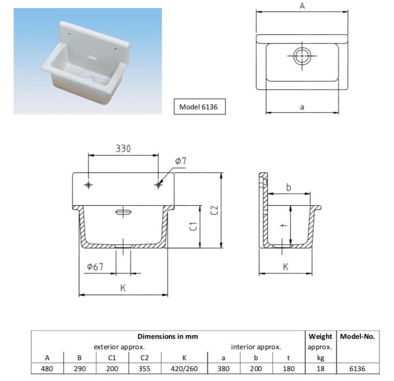 Odolná proti nárazu, teplotě,louhům a rozpouštědlům. Nástěnná vylévka plastová, se zadní stěnou proti ostřiku.